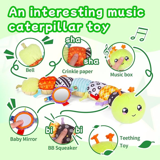SRICH Baby Musical Plush Caterpillar Toy - 0-12 Months Tummy Time & Head Lifting Soft Sensory Toy, Rattle, Rustling Sounds & Mirror, Perfect Gift for Boys & Girls