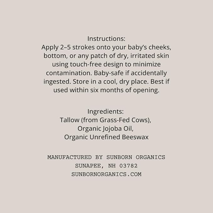 - ONLY THREE BABY-SAFE INGREDIENTS: Crafted with just three simple, natural ingredients you can trust: grass-fed tallow, organic jojoba oil, and organic unrefined beeswax – nothing else. Independently lab-tested for safety and purity. No chemicals, preservatives, fragrances, essential oils, or synthetics. Baby-safe if accidently ingested.
