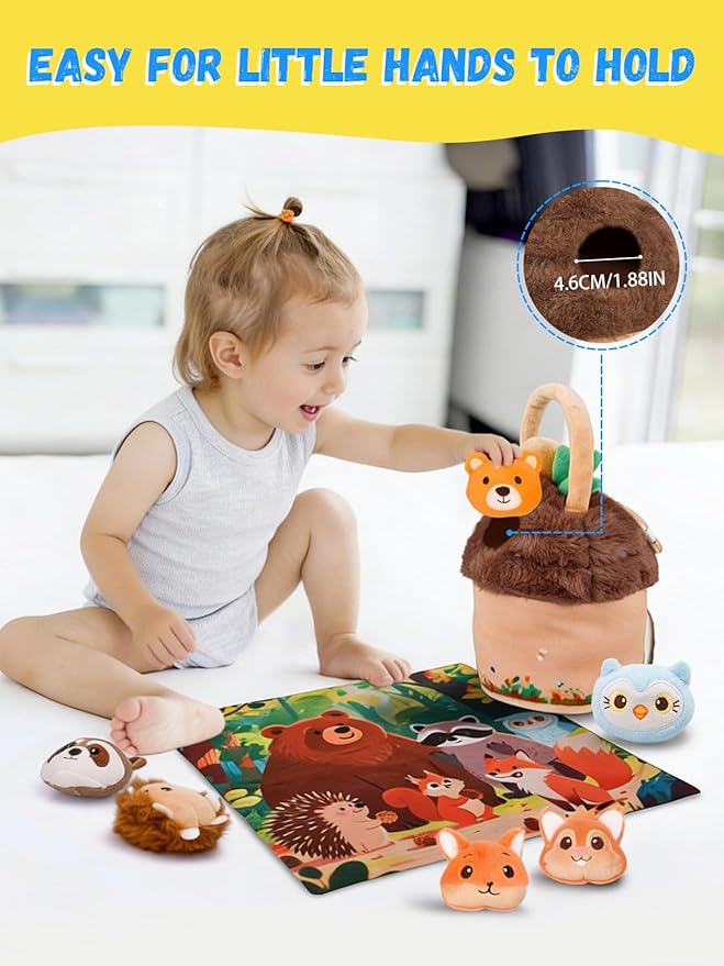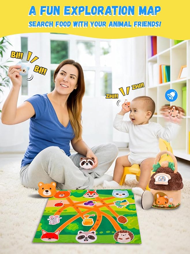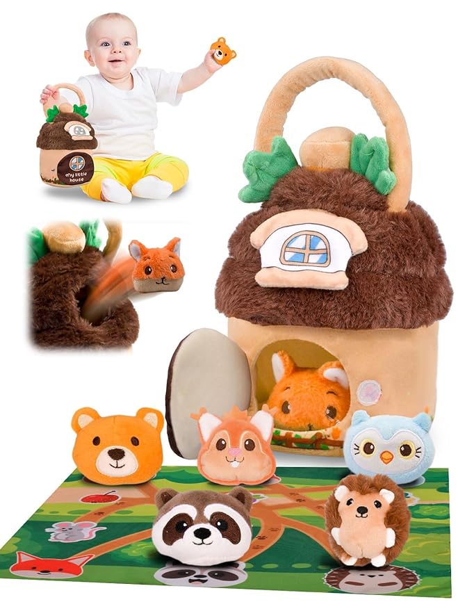 - Forest Animal Adventure Playset:This delightful plush baby toy set includes an animal cottage with open-and-close doors and windows, six forest animal stuffed animals (three with gentle sound effects), and an exploration map. The clever design encourages babies to explore actively, making learning fun through play