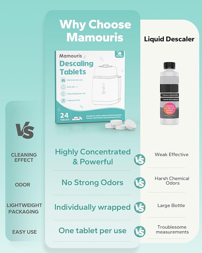 - Safe & Trusted by Moms: Made with baby-safe ingredients. These baby descaling tablets dissolve in 3 mins, leaving no residue or odor. Completely safe and reliable for moms