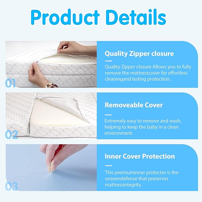 - Premium Surface Layer: To better protect your baby's delicate skin, the outer layer of the pack n play mattresses features a soft, breathable, hypoallergenic fabric. The inner layer is waterproof, effectively resisting liquid penetration. The surface layer is removable via zipper and machine washable for easy cleaning and maintenance.