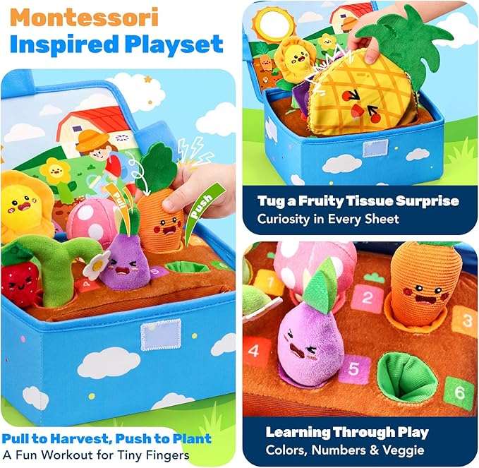 - Build Fine Motor Skills & Early Cognition: Pull and push to plant the veggie. A fun workout for tiny fingers to build finger dexterity, grip strength and hand-eye coordination. Tug tissues from the pocket, match colors to plant veggies, and explore fruity ABCs on the cover. A playful way to learn colors, alphabet, and more!