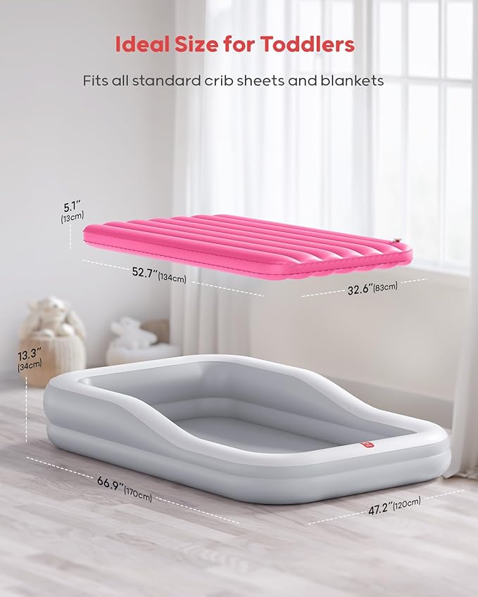 - Quick Inflation: Equipped with a high-power electric air pump and a professional three-in-one valve, this toddler travel bed inflates rapidly in just 1-2 minutes. Deflation is equally quick for easy storage, allowing effortless rolling up.
