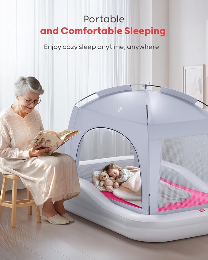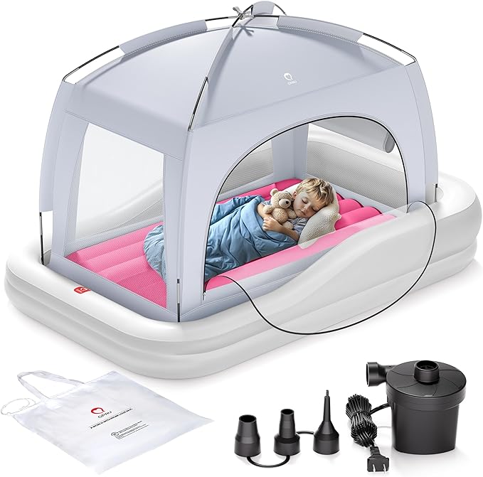 QPAU Inflatable Toddler Travel Bed with Tent, Portable Kids Air Mattress with Safety Sides, Ideal for Home, Grandma's, Camping, Traveling -Includes Fast Electric Pump