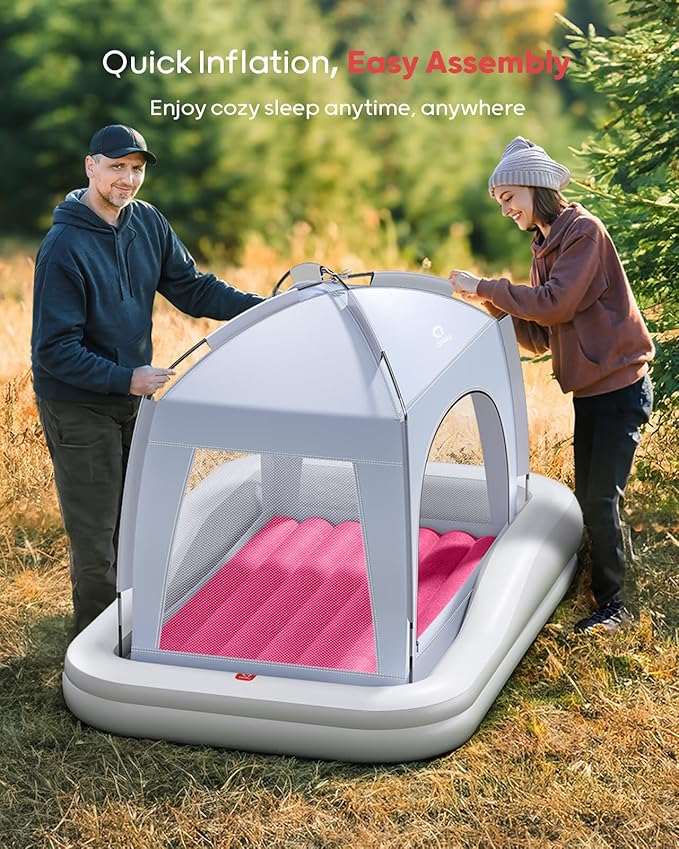 - Integrated Tent and Air Mattress Design: The integrated design of the tent and air mattress ensures a perfect fit, elevating indoor and outdoor sleeping comfort to new heights. Equipped with ultra-fine mesh mosquito netting and breathable sunshade fabric, the QPAU toddler blow up mattress addresses the two main challenges of outdoor camping: mosquito bites and harsh sunlight, making it the new choice for outdoor travel and camping.
