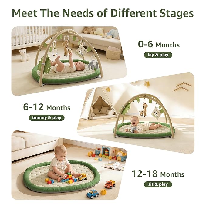 - Grow With Your Baby - The baby play gym is designed to develop stage-based sensory and motor skill. The soft mat provides a comfortable space for baby to release, entertain and learn, and the 5 hanging toys can stimulate baby's sight hearing and touch, they can effectively enhance the development of sensory perception and improve physical coordination, grow with your baby from age 0-18 months to toddler