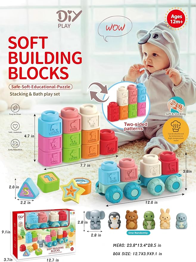 - 【6-in-1 Educational Playset】 This 29-piece set is a complete learning center! It includes soft blocks with first words (fruits & animals), 4 shape-sorter building blocks, 2 connectable wagons, and a random animal figure for versatile play.