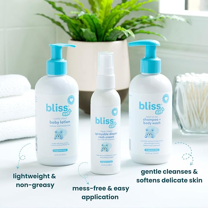 - What is included in the Bliss Baby Care Essentials Gift Set - This set includes fragrance free baby wash and shampoo, diaper rash cream spray, soothing baby lotion, and a soft hooded owl towel. Everything parent's need for gentle bath time and diaper care in one complete baby gift set.
